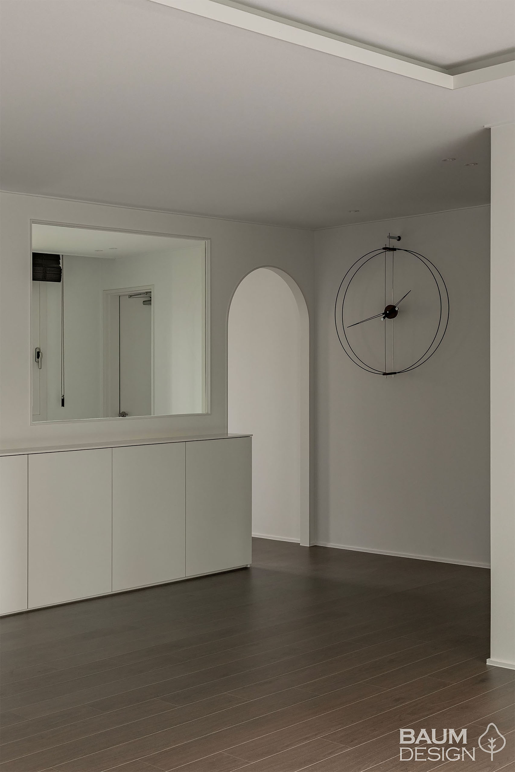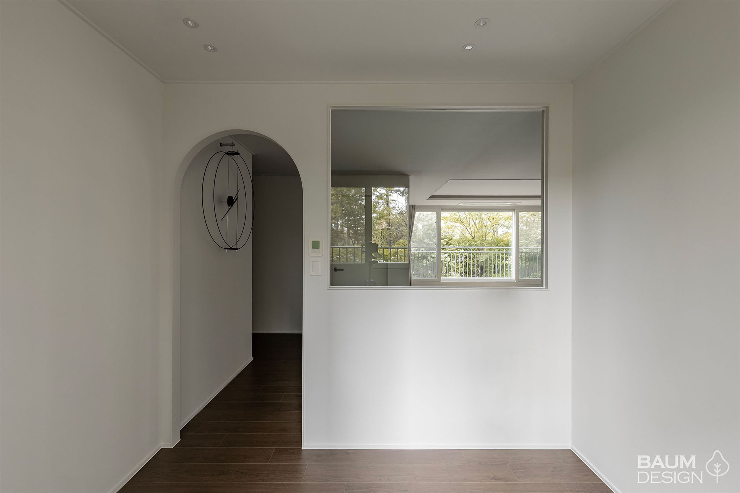 화이트 톤의 마감과 어두운 톤의 우드 마루가 잘 어우러진 인테리어