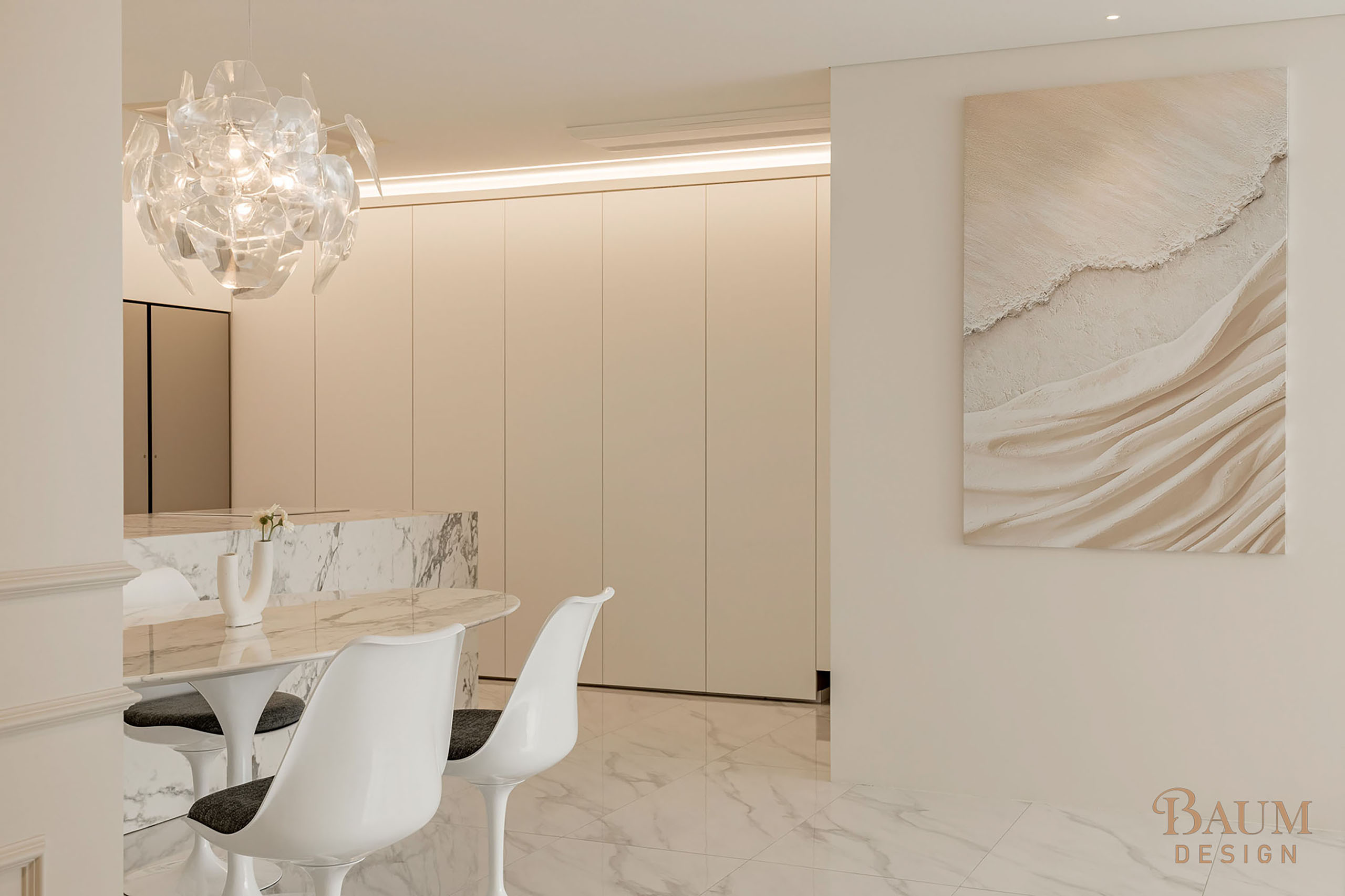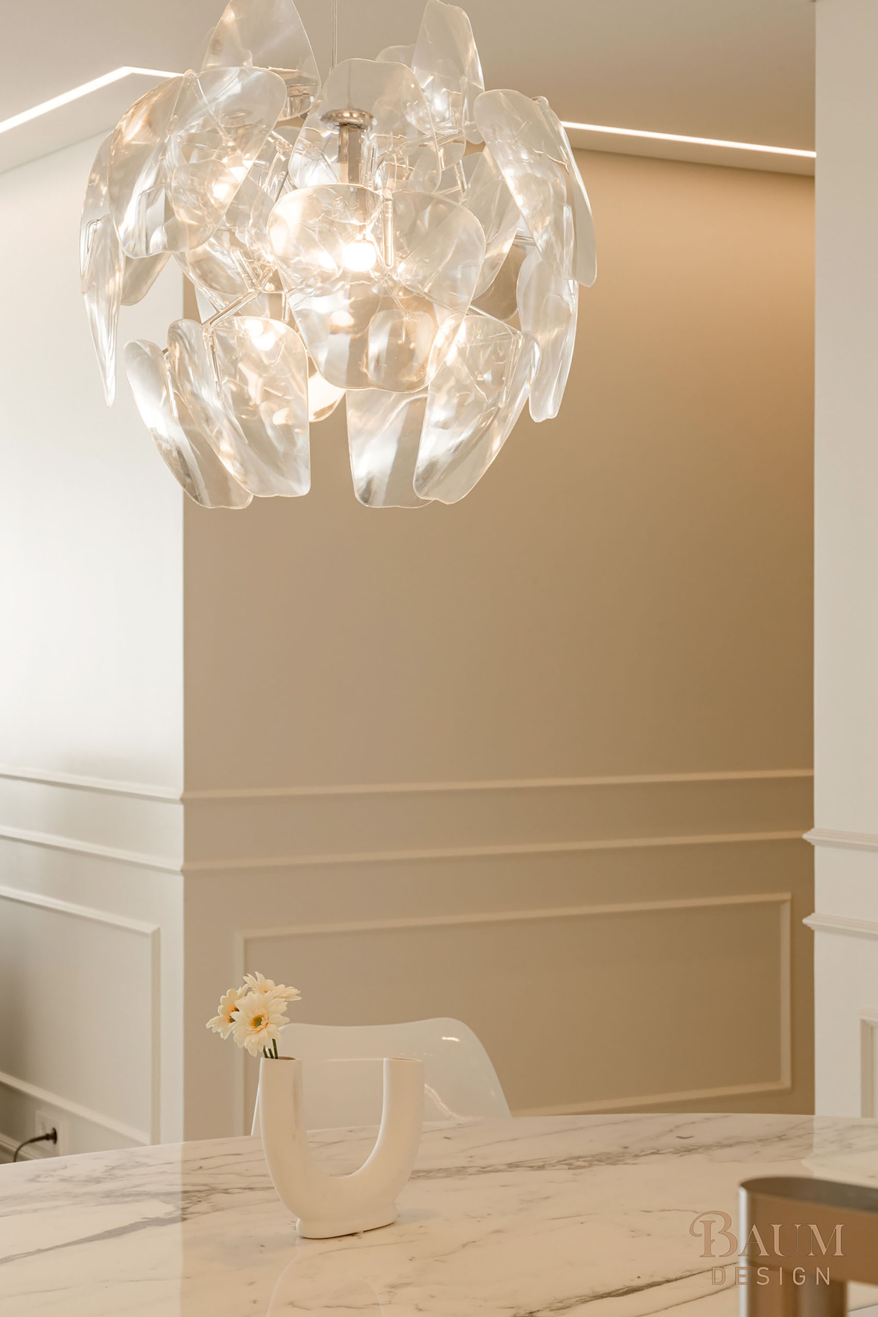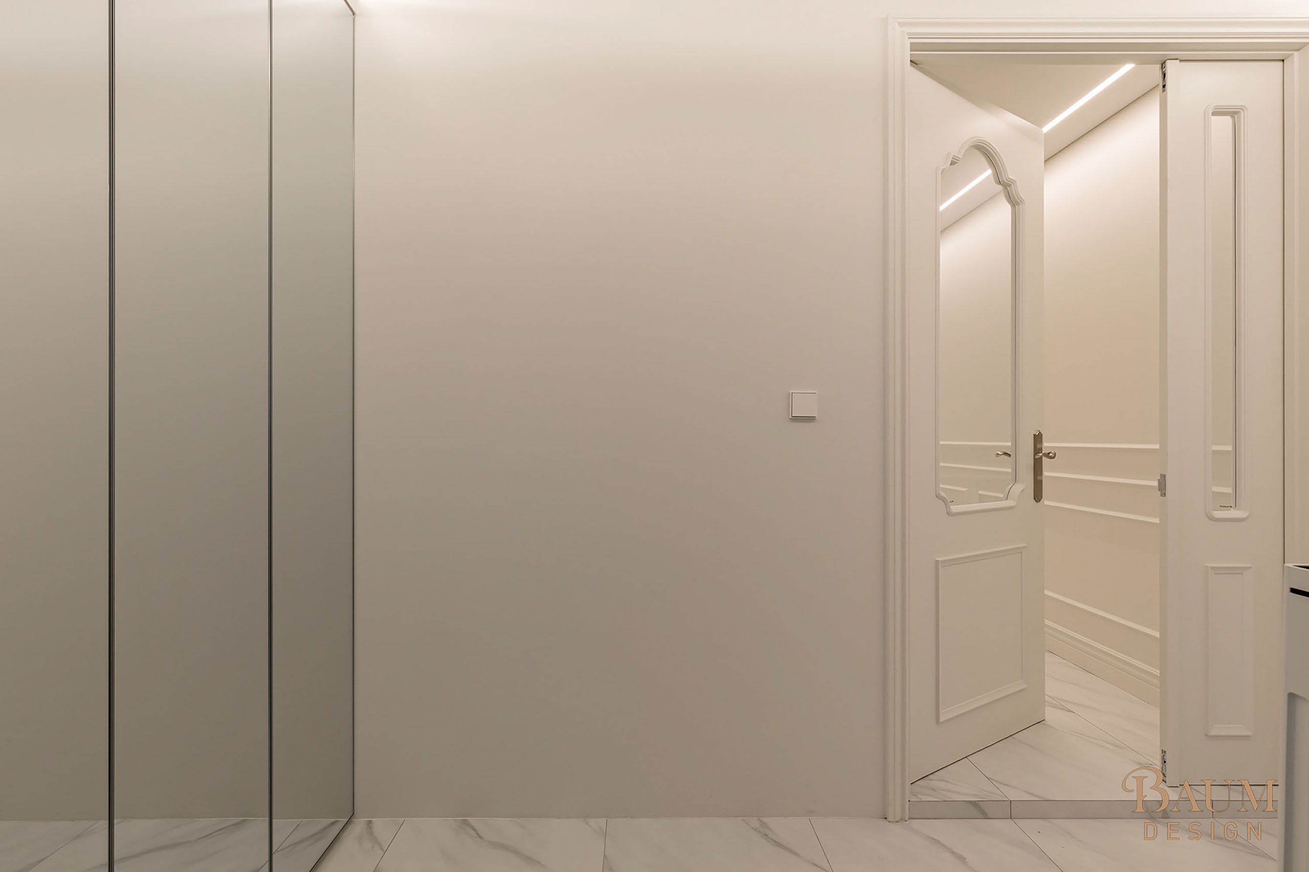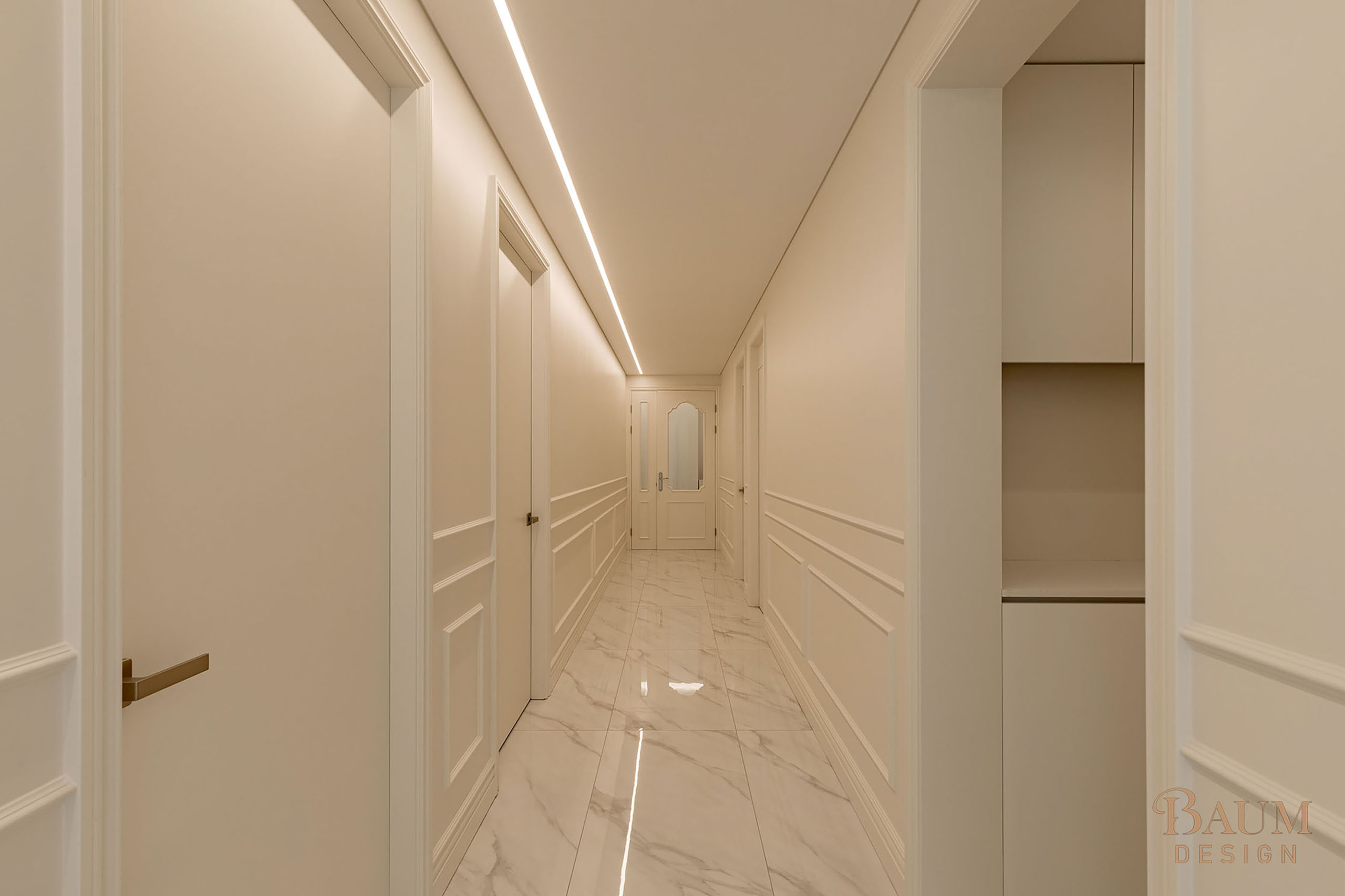 베이지 컬러의 우아한 웨인스코칭 벽면 마감과 세련된 대리석 시공으로 안정감이 느껴지는 인테리어