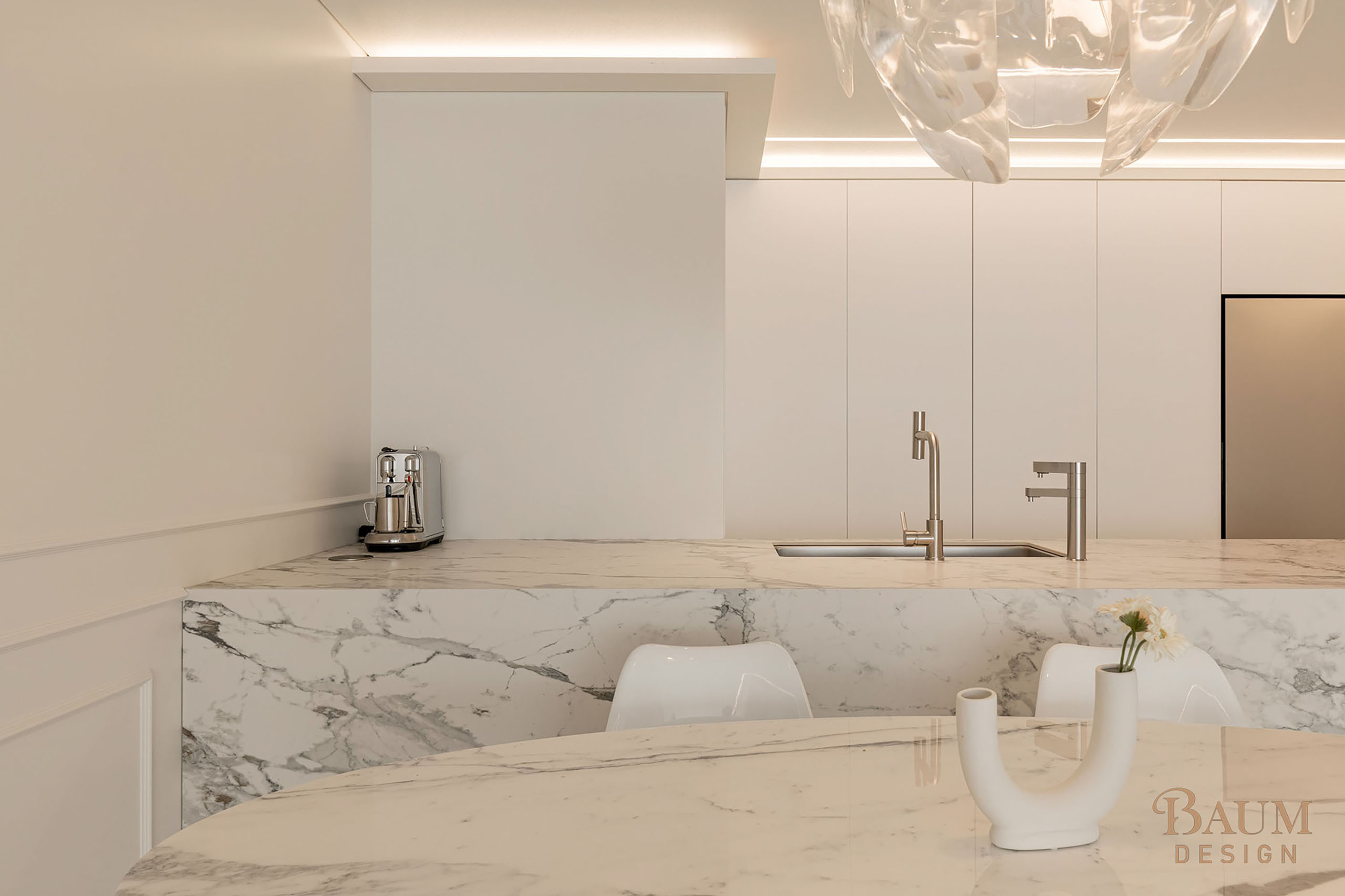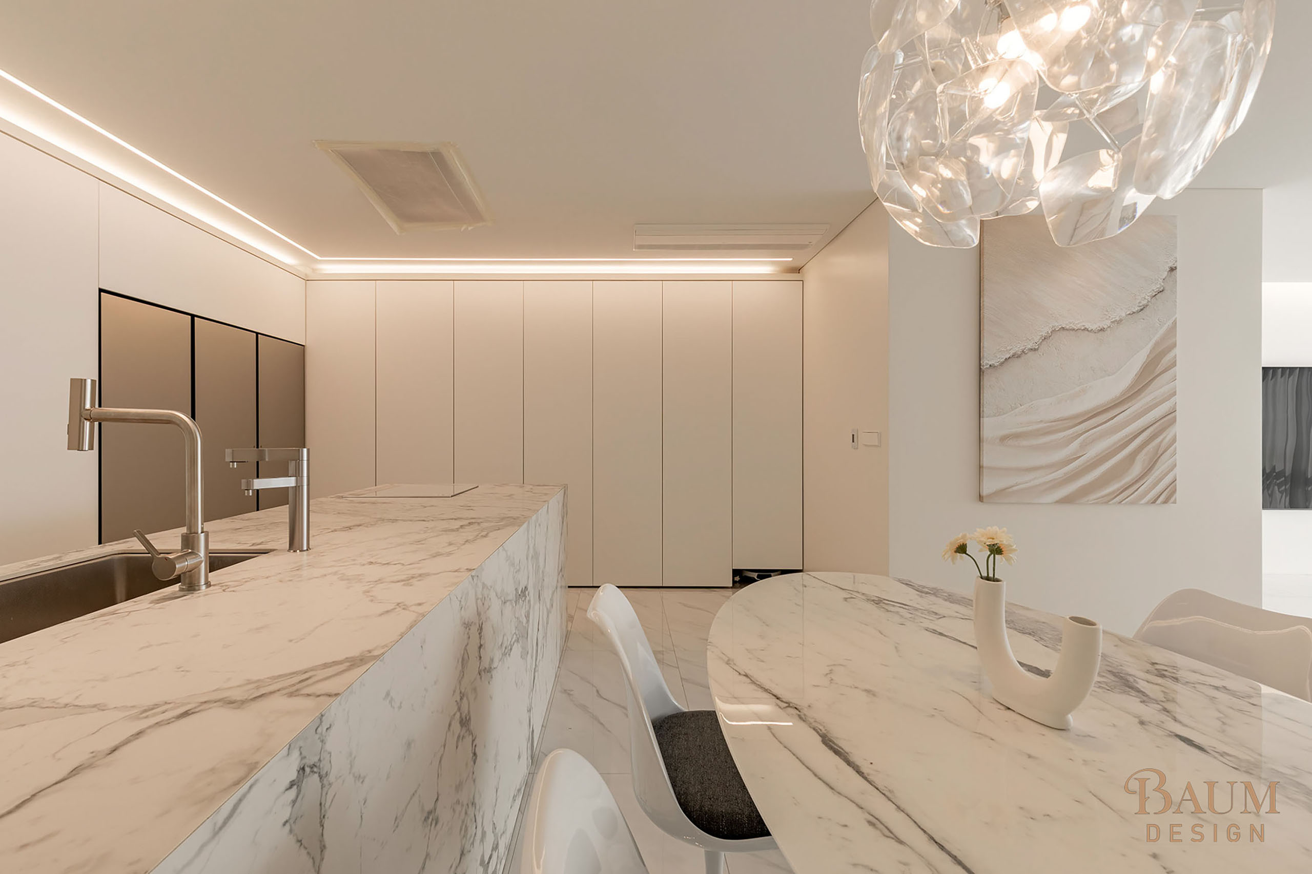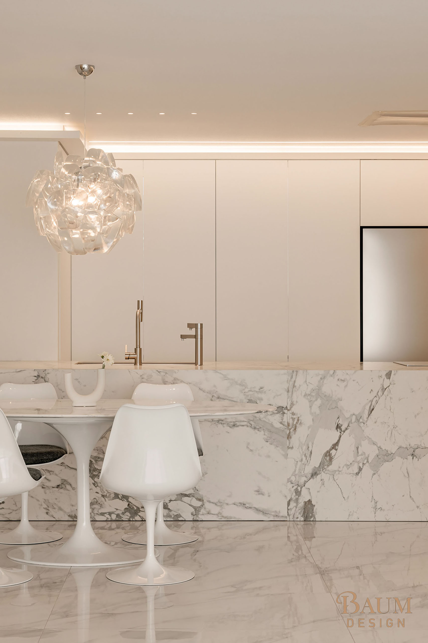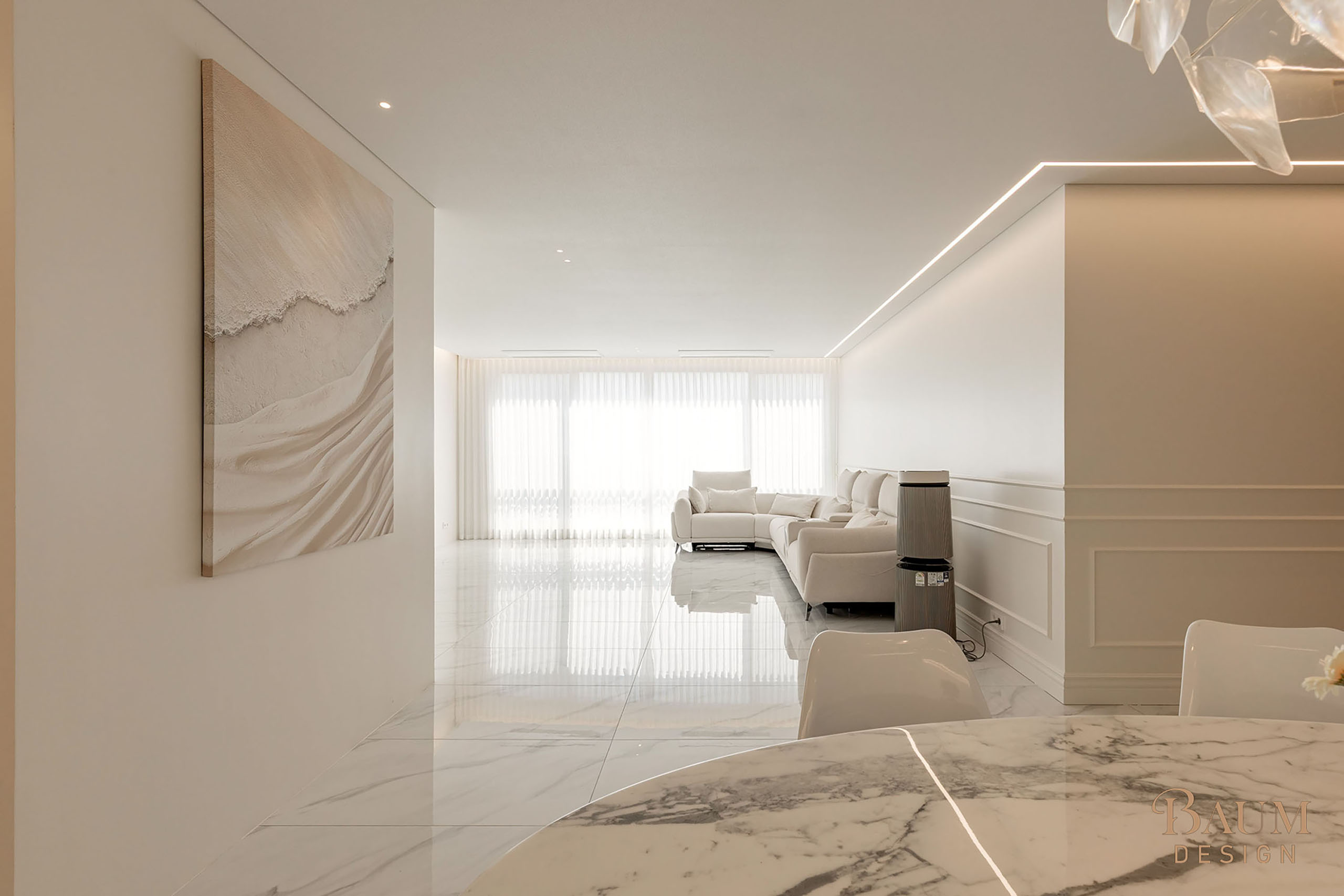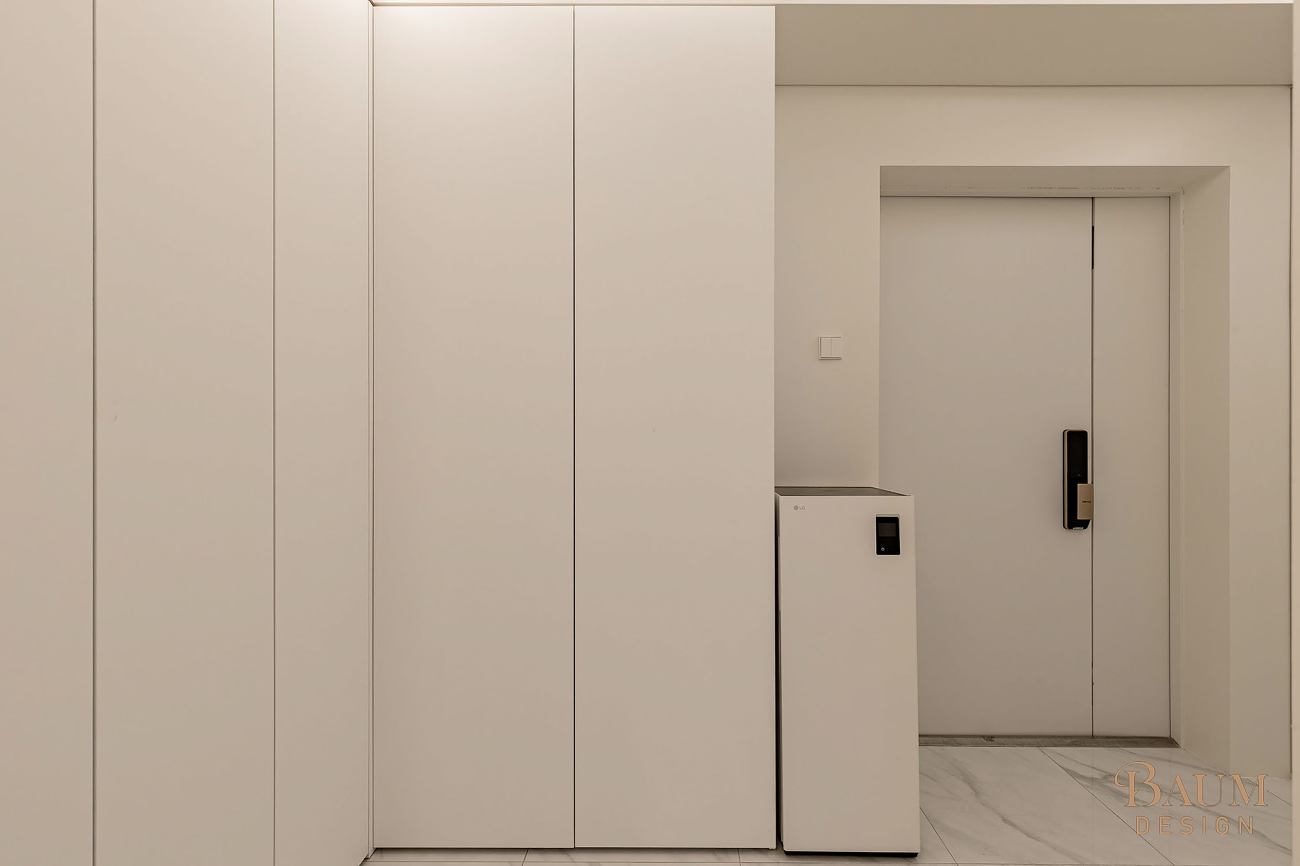베이지 컬러의 우아한 웨인스코칭 벽면 마감과 세련된 대리석 시공으로 안정감이 느껴지는 인테리어